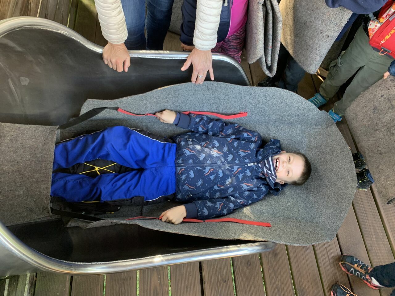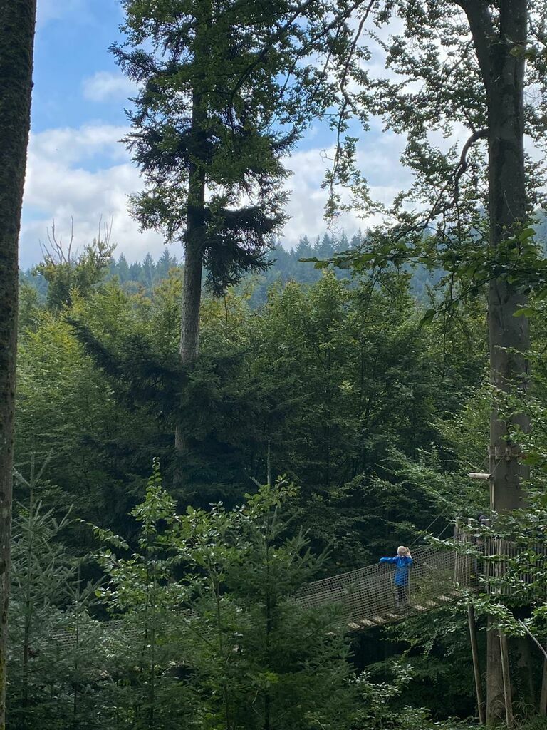 Oben angekommen, hatten sich alle eine Pause verdient. Gemeinsam packten Kinder und Lehrer ihr Vesper aus und stärkten sich erst einmal, bevor es weiterging. Danach wurden die Hängebrücken erkundet, der tolle Spielplatz ausprobiert und natürlich der Baumkronenweg selbst begangen. Stück für Stück kam dann auch die Sonne heraus.