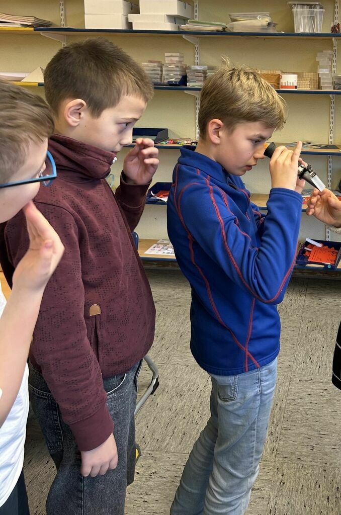 Anschaulich und altersgerecht erklärte sie den Kindern den Weg von der Traube zum Wein. Zunächst durften die Schülerinnen und Schüler die mitgebrachten Weintrauben probieren. Anschließend bestimmten sie mithilfe eines Oechsle-Messgeräts den Zuckergehalt der Trauben. Dabei lernten sie, dass bei der Entwicklung vom Traubensaft zum Wein der Zucker durch Hefe umgewandelt wird – eine wichtige Erkenntnis, um zu verstehen, warum Wein Kindern nicht schmeckt.