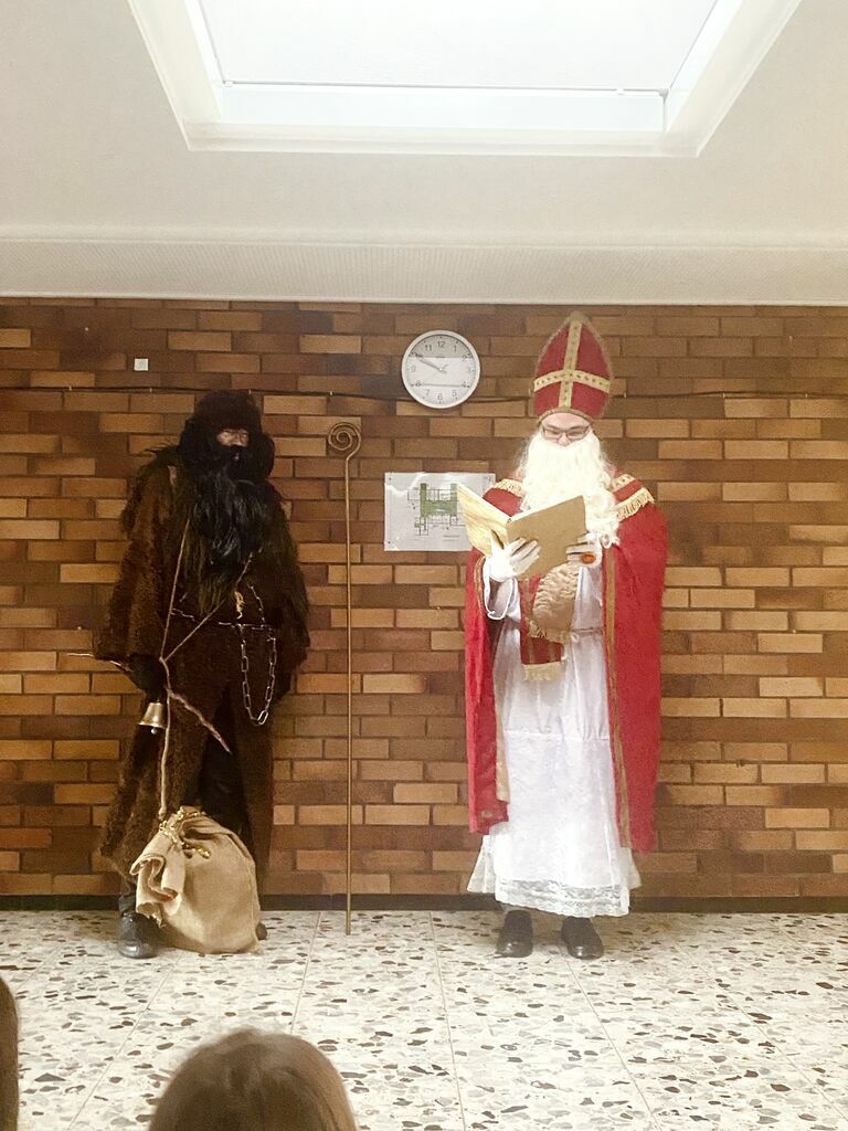 Am 8. Dezember 2025 hatten wir besonderen Besuch: Der Nikolaus und Knecht Ruprecht kamen an unsere Schule. Nachdem der Nikolaus aus seinem goldenen Buch vorgelesen und die Klassen begrüßt hatte, folgte ein kleines Programm der Jahrgangsstufe 2.