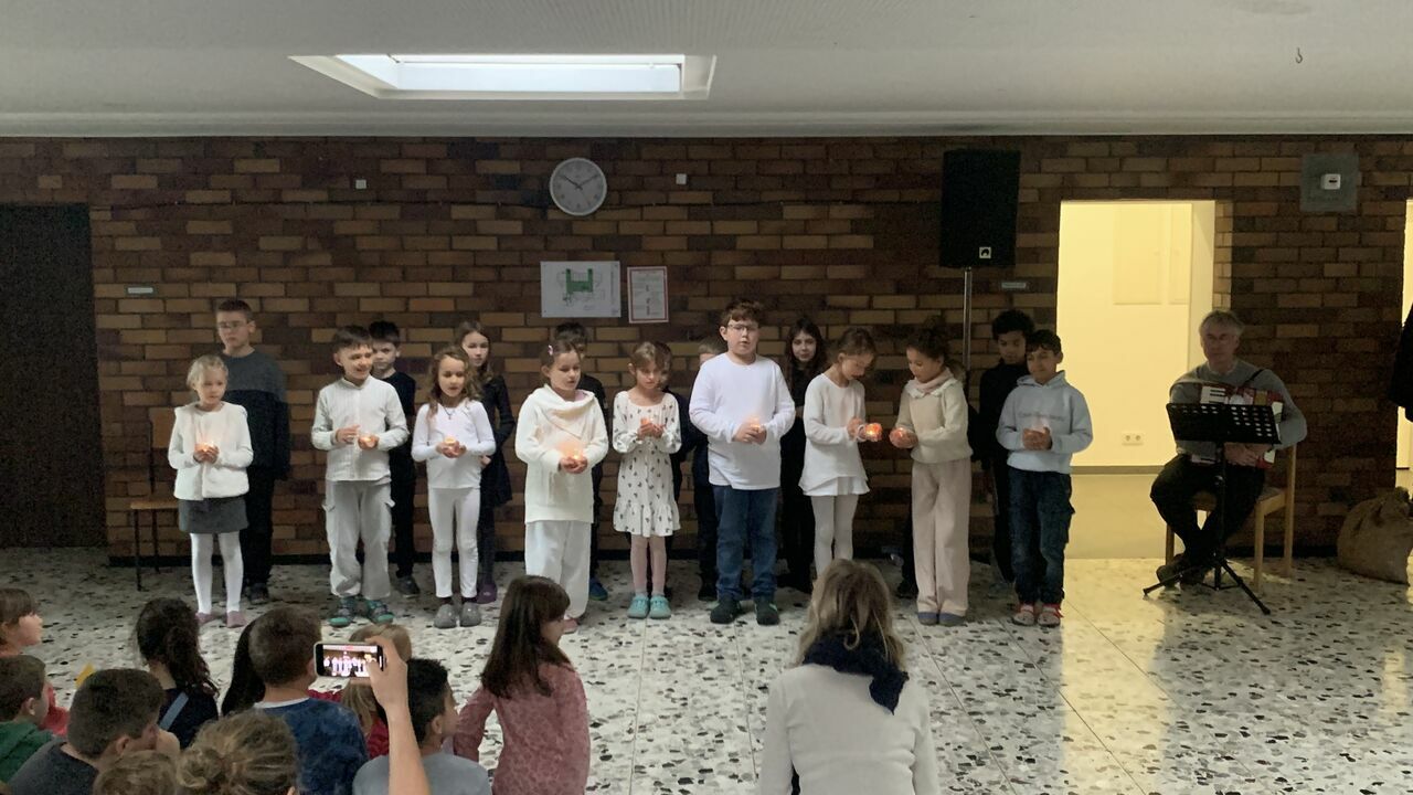 Die Klasse 2a sang das Lied „Zünd ein Licht an“, und die 2b präsentierte ihr kleines Theaterstück „Sternenhimmel“. Unsere „Füchse“ und „Wölfe“ sorgten damit auf ihre ganz eigene Weise für Licht und strahlende Momente in der Adventszeit.