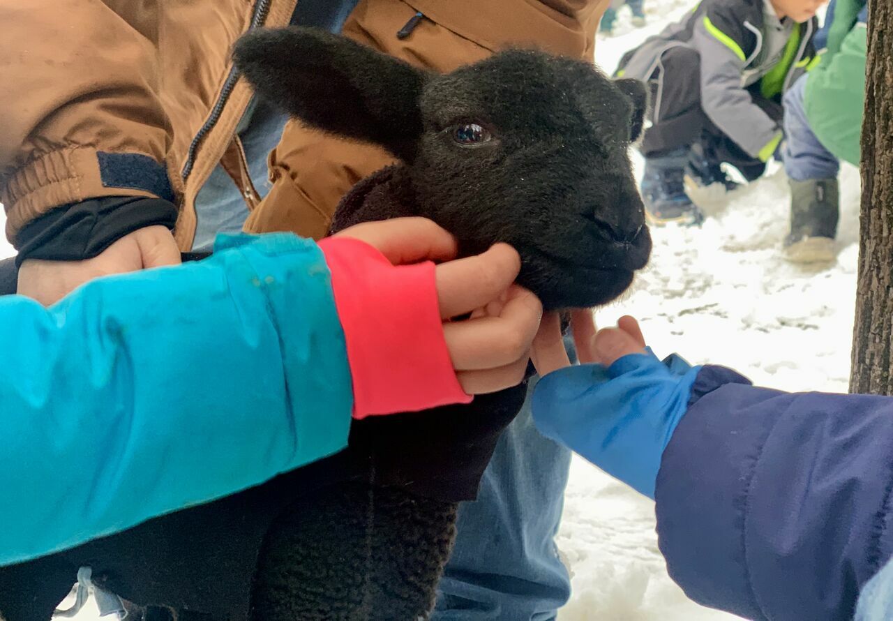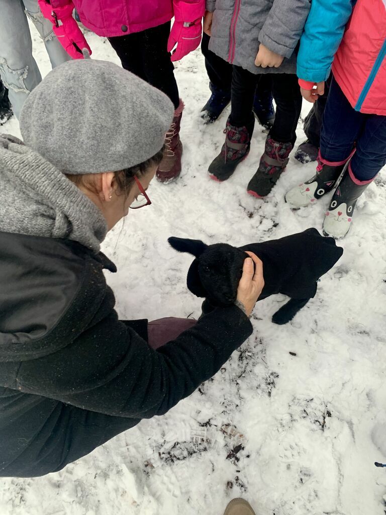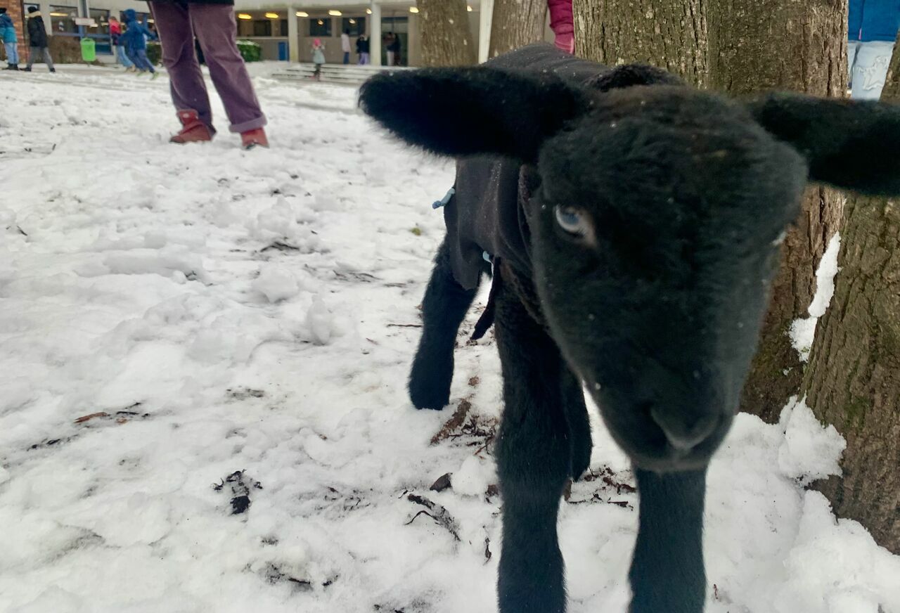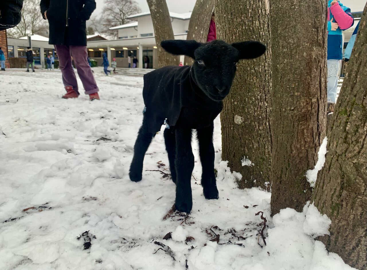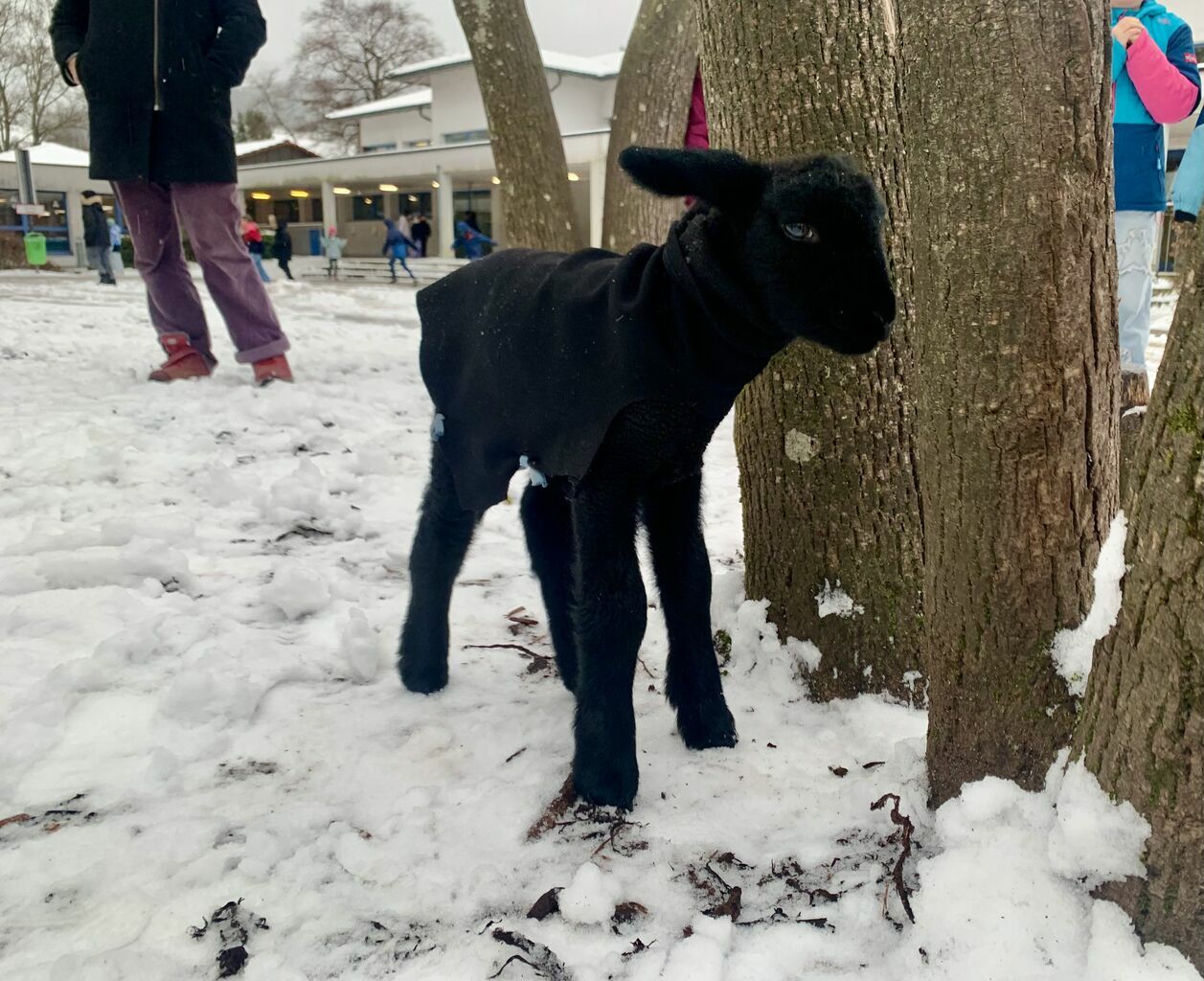 Unsere Schulbegleitung der Klasse 1, Frau Birkle, hat momentan ein Lämmchen, das mit der Flasche aufgezogen werden muss. Und da sie heute keinen Lämmchen-Sitter hat, muss Silvester, der in der Silvesternacht geboren wurde, eben mit zur Schule. Ein absolutes Highlight für unsere Kinder! Er ist genau eine Woche alt und alles andere als scheu.