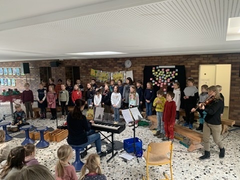 Am 1. Dezember, der gleichzeitig der erste Advent in diesem Jahr ist, begrüßen die Klassen 3a und 3b, zusammen mit ihren Lehrerinnen ihre Eltern, Großeltern, Freunde und Verwandte in der Aula. Die dritten Klassen schaffen eine unglaublich schöne Einstimmungsatmosphäre auf die bevorstehende Weihnachtszeit. Es werden Lieder gesungen, die von Frau Schleske mit dem Klavier und von Frau Silcher mit der Geige begleitet werden.