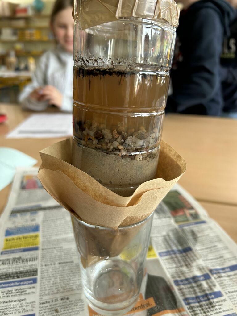Im nächsten Schritt erforschten die Kinder das Thema Versickerung. Sie führten verschiedene Versuche durch, um herauszufinden, durch welche Erdschichten Wasser am besten versickern kann. Dazu verwendeten sie unterschiedliche Materialien wie Sand, Erde, Lehm und Kies. Die Kinder gossen Wasser auf die verschiedenen Schichten und beobachteten, wie schnell das Wasser durch die einzelnen Materialien hindurchfloss. Dabei lernten sie, dass grobkörnige Materialien wie Kies eine schnellere Versickerung ermöglichen, während feinkörnige Materialien wie Lehm das Wasser langsamer durchlassen. Diese praktischen Erfahrungen halfen den Kindern, ein besseres Verständnis für die Eigenschaften von Böden zu entwickeln.