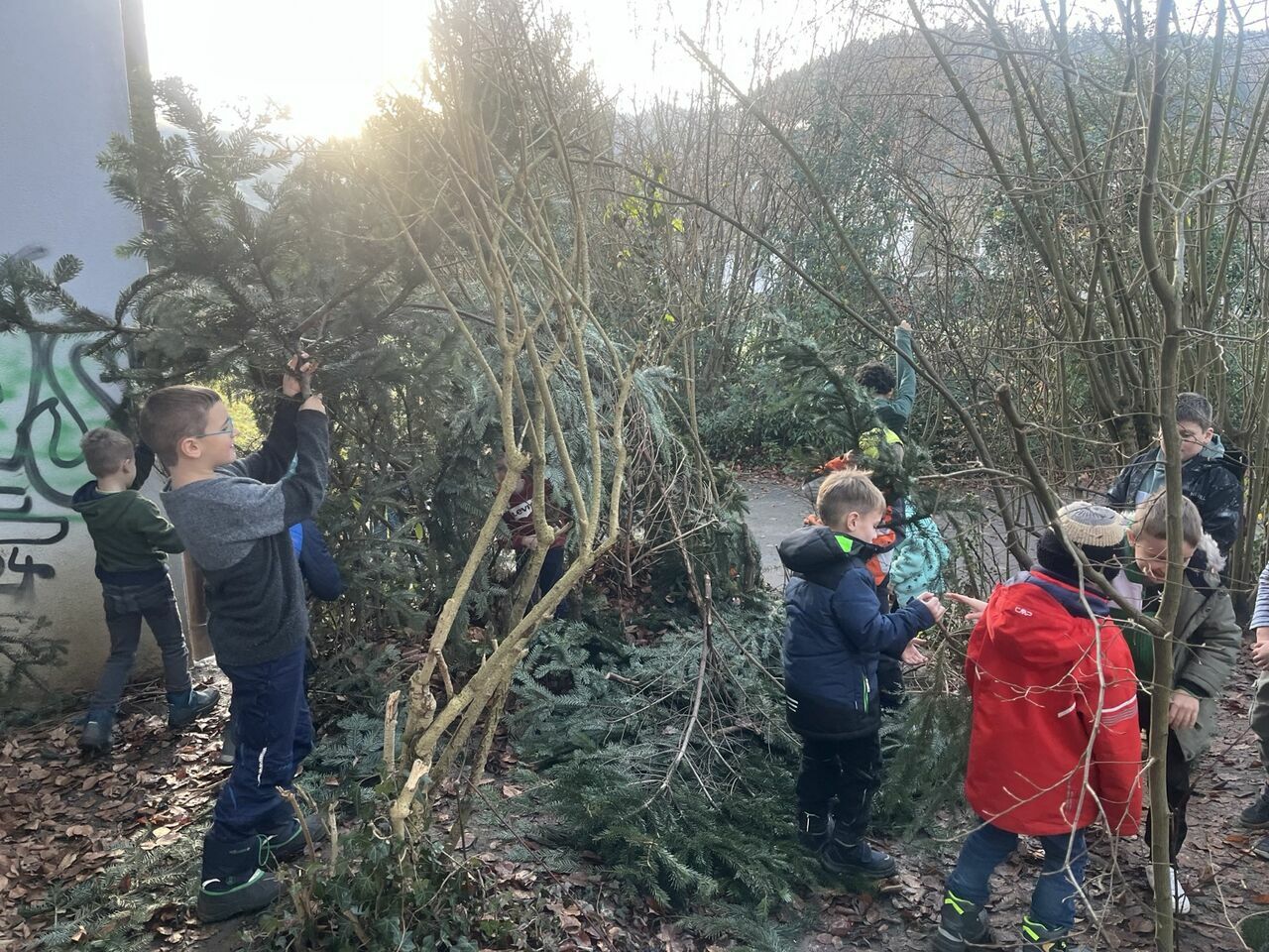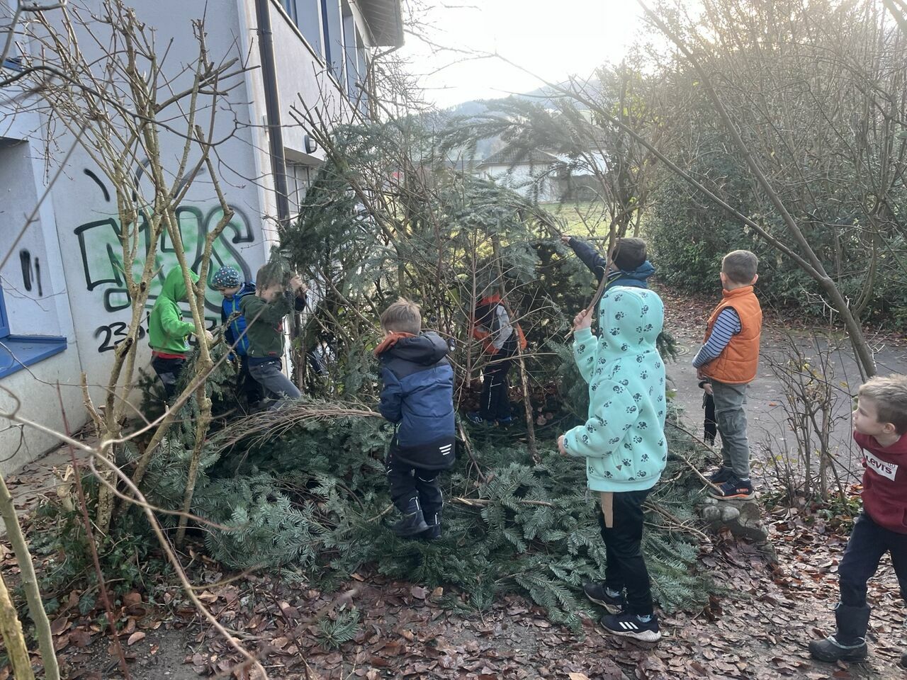 Manchmal entstehen die schönsten Dinge ganz von selbst: Nachdem die Advents- Dekoration bereits fertig war, lag auf unserem Schulhof noch Tannenreisig herum. Unsere Zweitklässler ließen sich davon inspirieren und begannen eigenständig, daraus eine Hütte zu bauen.